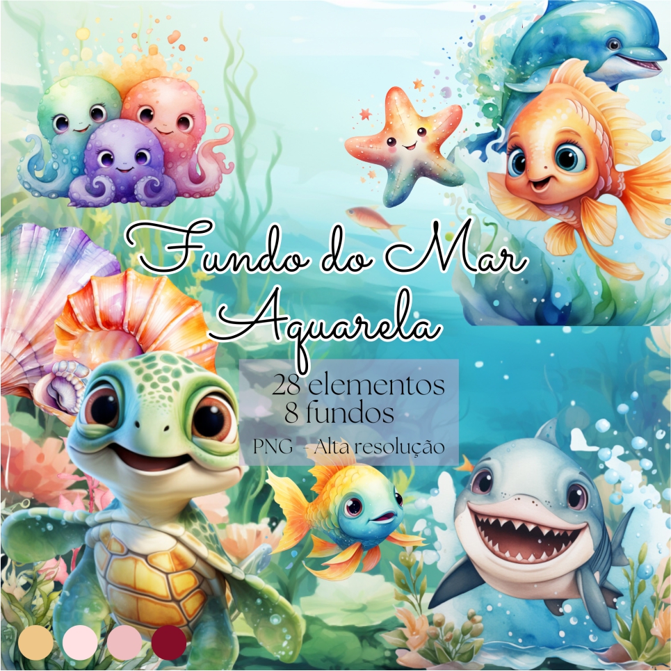 Kit Digital Fundo do Mar Aquarela em Png com Fundo Transparente