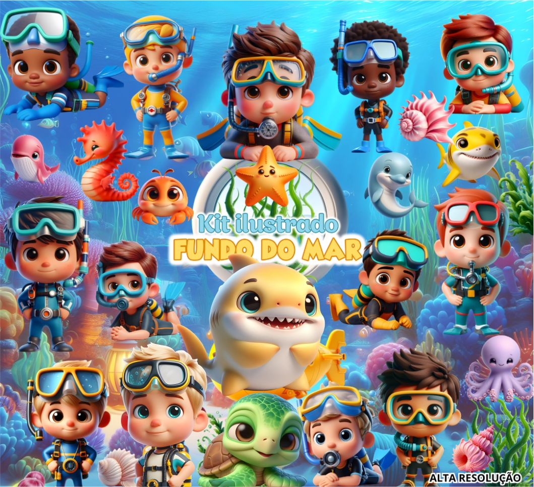 Kit Digital Fundo do Mar Menino Aquarela em Png com Fundo Transparente