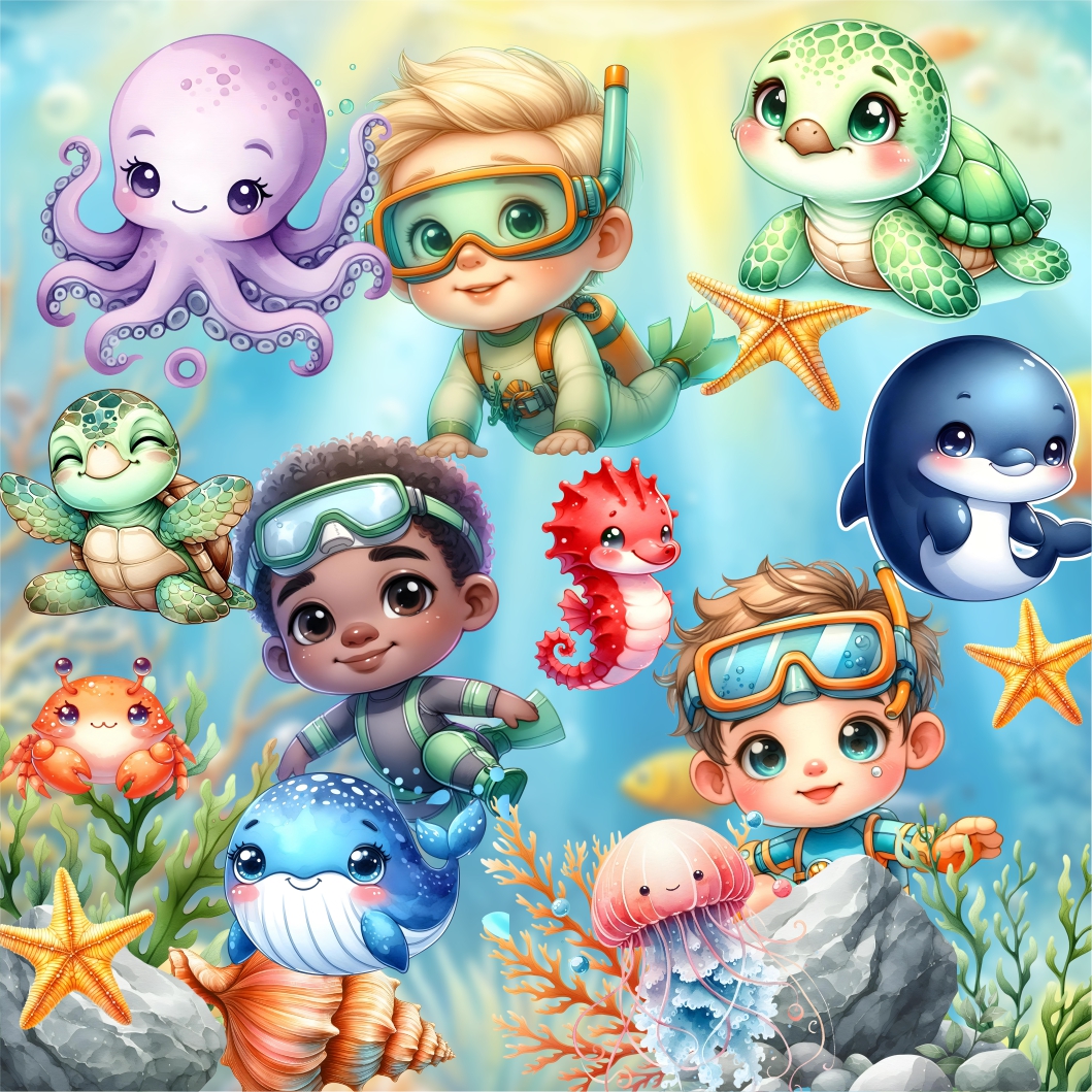 Kit Digital Fundo do Mar Menino Aquarela em Png com Fundo Transparente